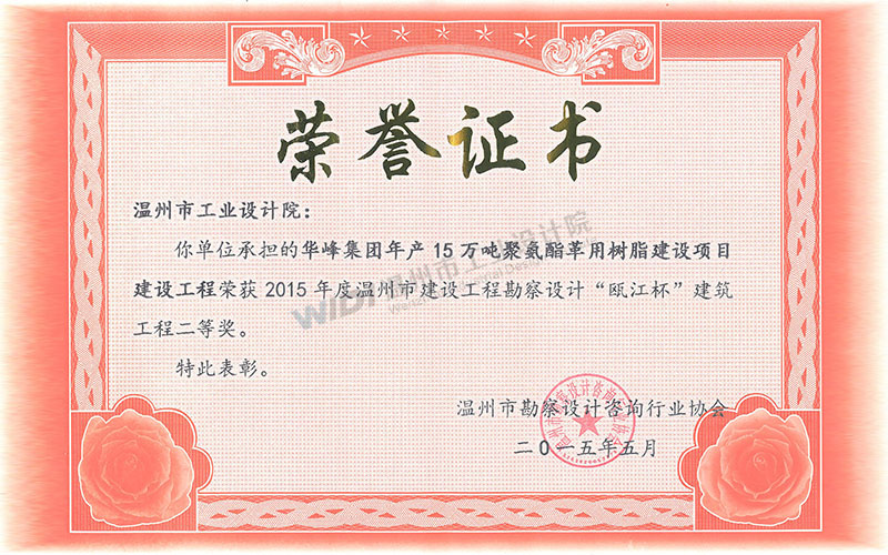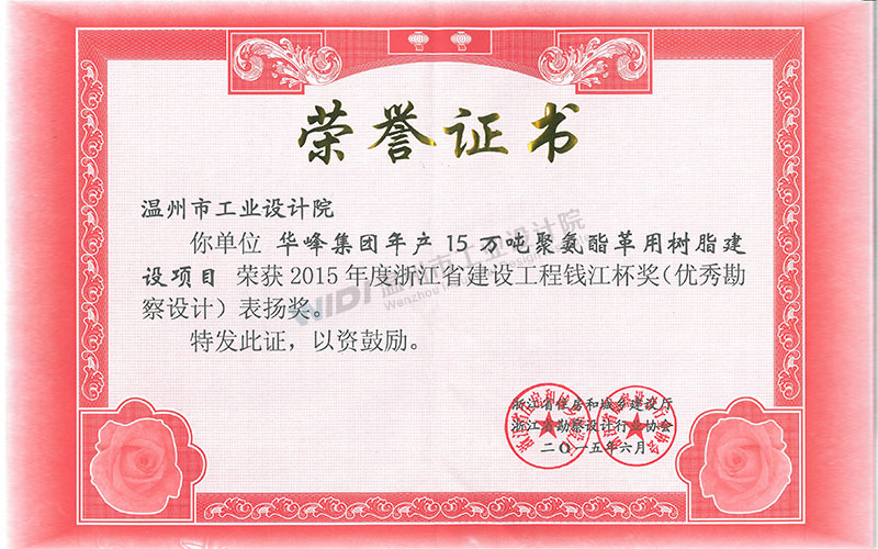 華峰集團(tuán)年產(chǎn)15萬噸聚氨酯革用樹脂建設(shè)項(xiàng)目建設(shè)工程 錢江杯表揚(yáng)獎(jiǎng)