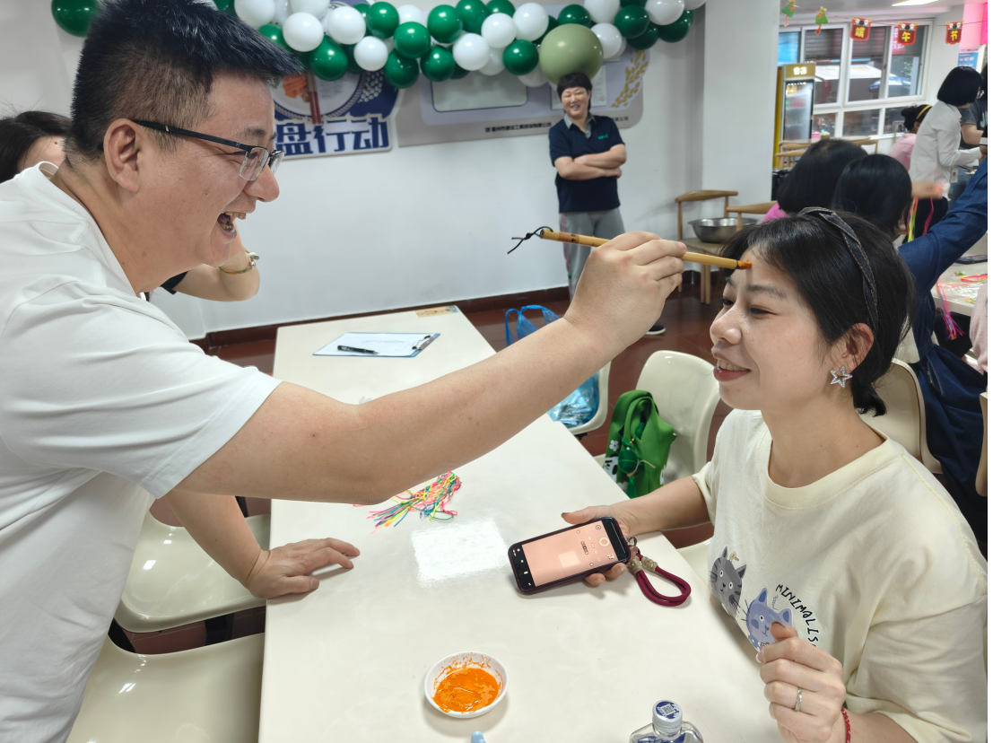 除了包粽子外,還組織了縫香包、編蛋袋、撞蛋、點(diǎn)額等形式多樣的活動(dòng)。其中點(diǎn)額儀式則是端午節(jié)活動(dòng)中的一項(xiàng)重要儀式。現(xiàn)場擺放著雄黃酒和艾草制品,大家將雄黃酒點(diǎn)在額頭、耳后、手腕等處,雄黃酒香氣四溢、艾草清香撲鼻,構(gòu)成了端午獨(dú)特的氣息,這不僅是對傳統(tǒng)文化的尊重與傳承,更是讓我們在現(xiàn)代生活中仍感受到那份來自古代的智慧與關(guān)懷。